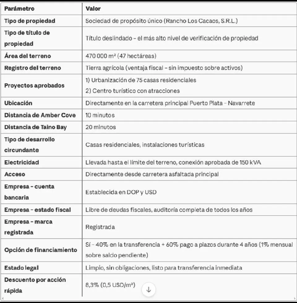 El terreno está registrado como suelo agrícola con ventaja fiscal: sin impuesto sobre activos. El acceso es directo desde la carretera principal Puerto Plata – Navarrete, lo que garantiza excelente conectividad y visibilidad. La electricidad llega hasta el límite de la parcela, con un proyecto aprobado de conexión de 150 kVA.